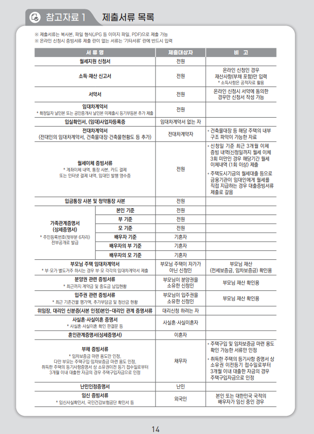 | 5 | 월세 이체 증빙서류 | 최근 3개월 내 1회 이상 이체내역 제출(계좌이체 내역, 통장 사본, 카드결제, 영수증 등) |