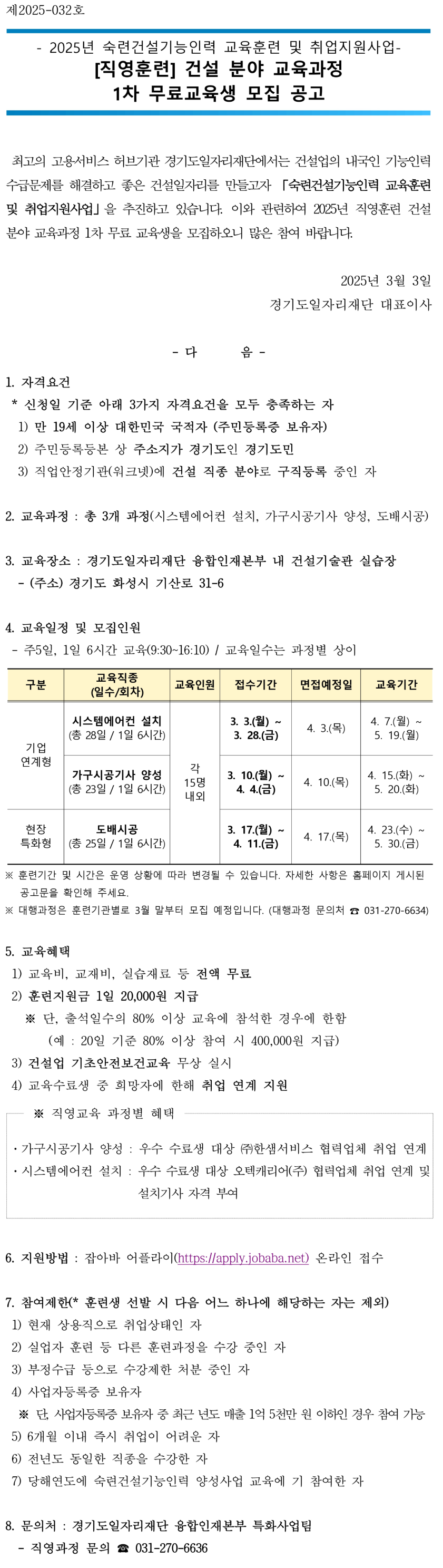 모집 대상은 도배시공 분야에서 일하고자 하는 만 20세 이상의 성인 남녀로, 학력이나 경력의 제한 없이 누구나 신청할 수 있다. 다만, 이미 건설기능직으로 근무 중인 종사자나 외국인은 신청 대상에서 제외된다.