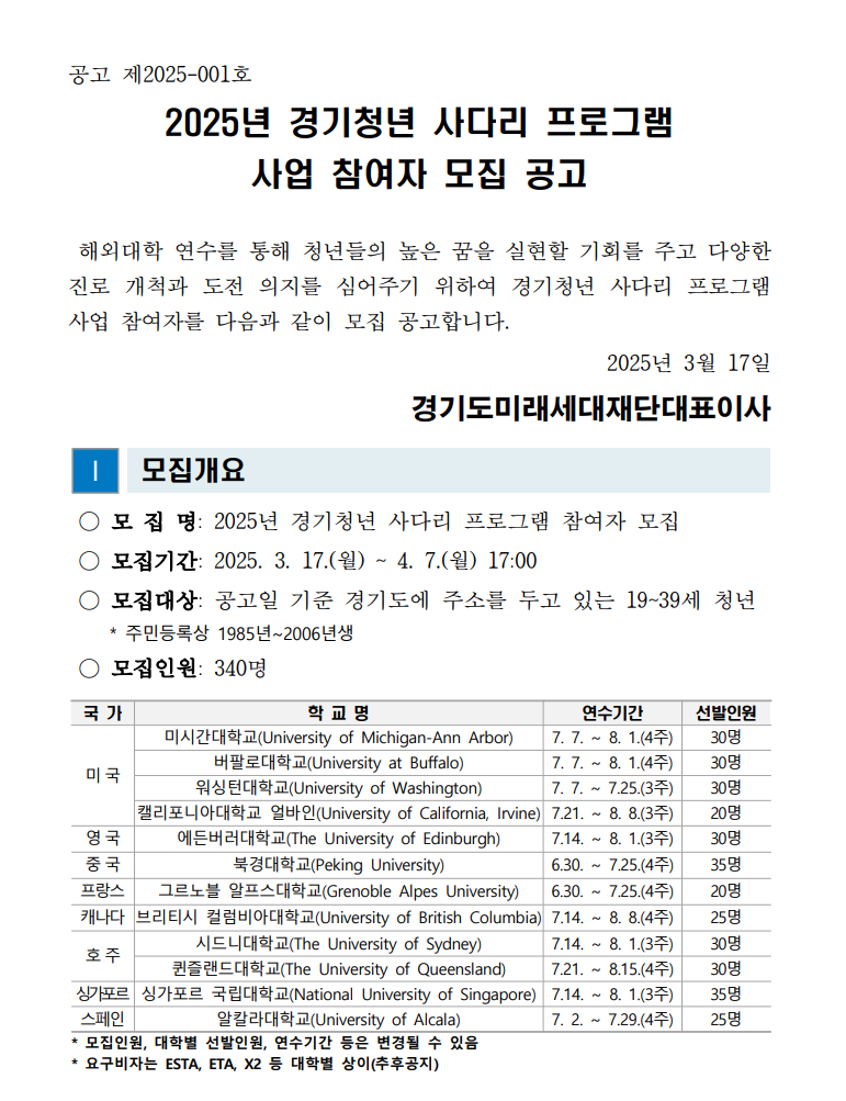 경기도 청년의 글로벌 도전! 전액 지원으로 해외 명문대 연수의 기회를 잡으세요.