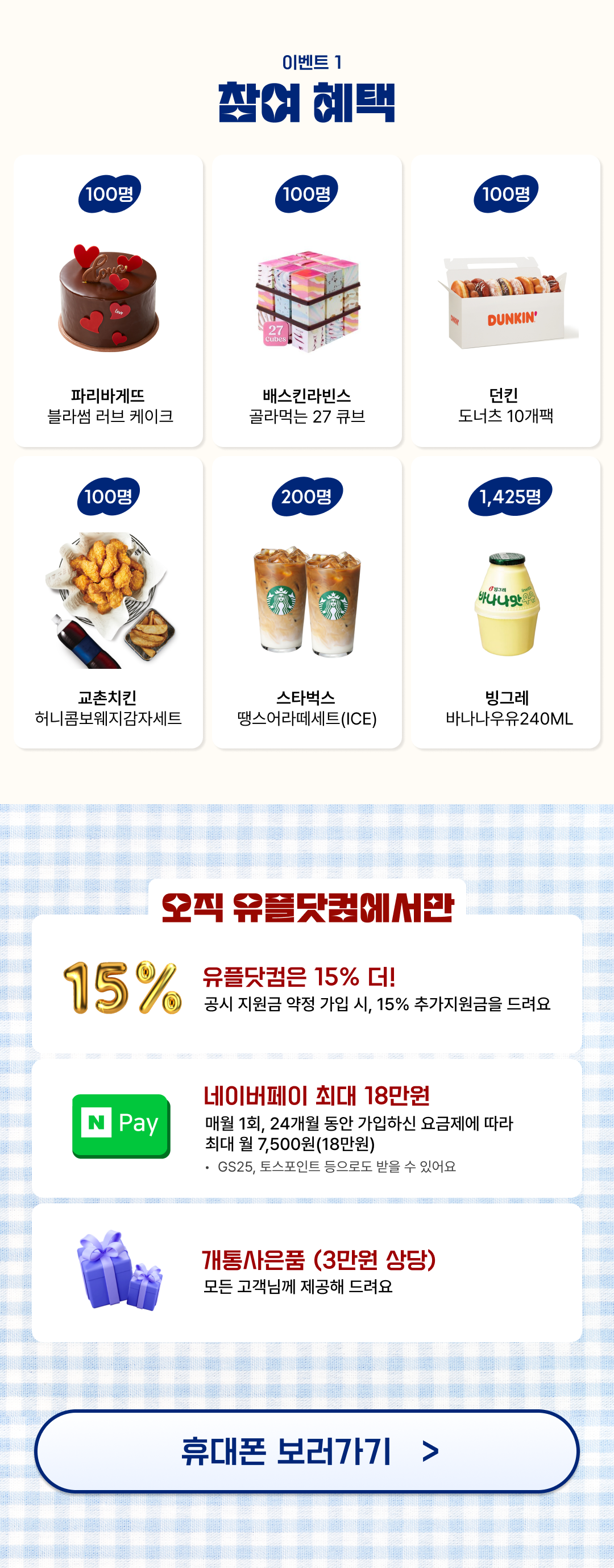 - 네이버페이 포인트, GS25 상품권, 토스포인트 등으로 매월 최대 7,500원씩 24개월간 총 18만 원 혜택 제공